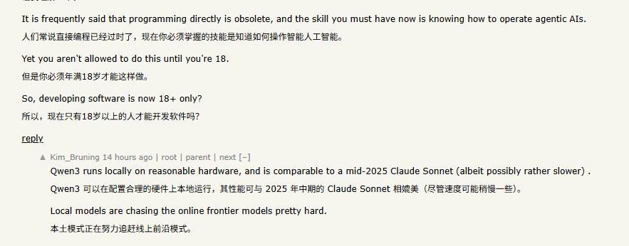 对此,有用户在讨论中直接祭出了阿里的Qwen3.5作为首选替代,其在代码理解、推理和多文件编辑上的出色表现,“它能在合理硬件上本地运行,性能接近2025年中期的Claude Sonnet,尽管速度可能慢一些。”但本地模型正在努力追赶云端闭源模型,这将是一个可靠的后备方案。